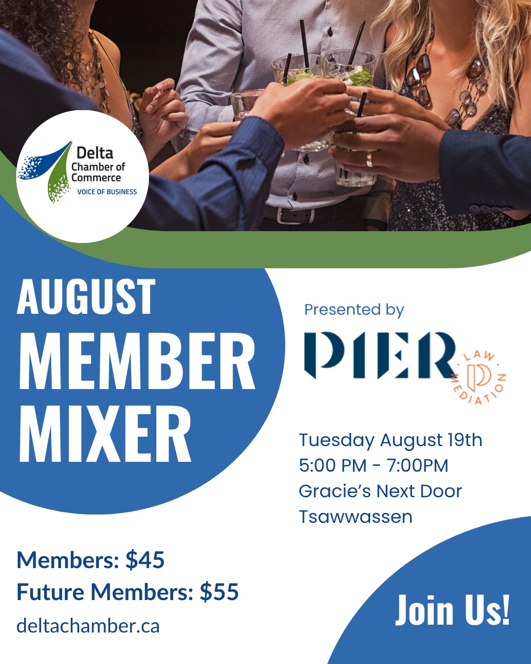 Join us for a vibrant summer evening at the August Member Mixer, proudly presented by Pier Law & Mediation and hosted at Gracie’s Next Door; one of Tsawwassen’s favourite local spots.