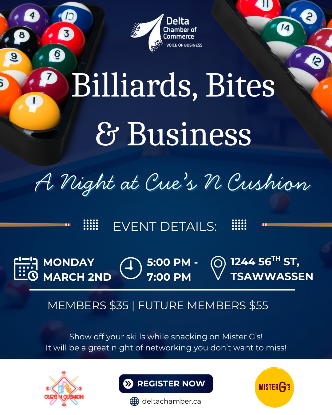 Join us for an engaging evening at Cue’s N Cushion, featuring relaxed networking with fellow members of the Delta business community.
