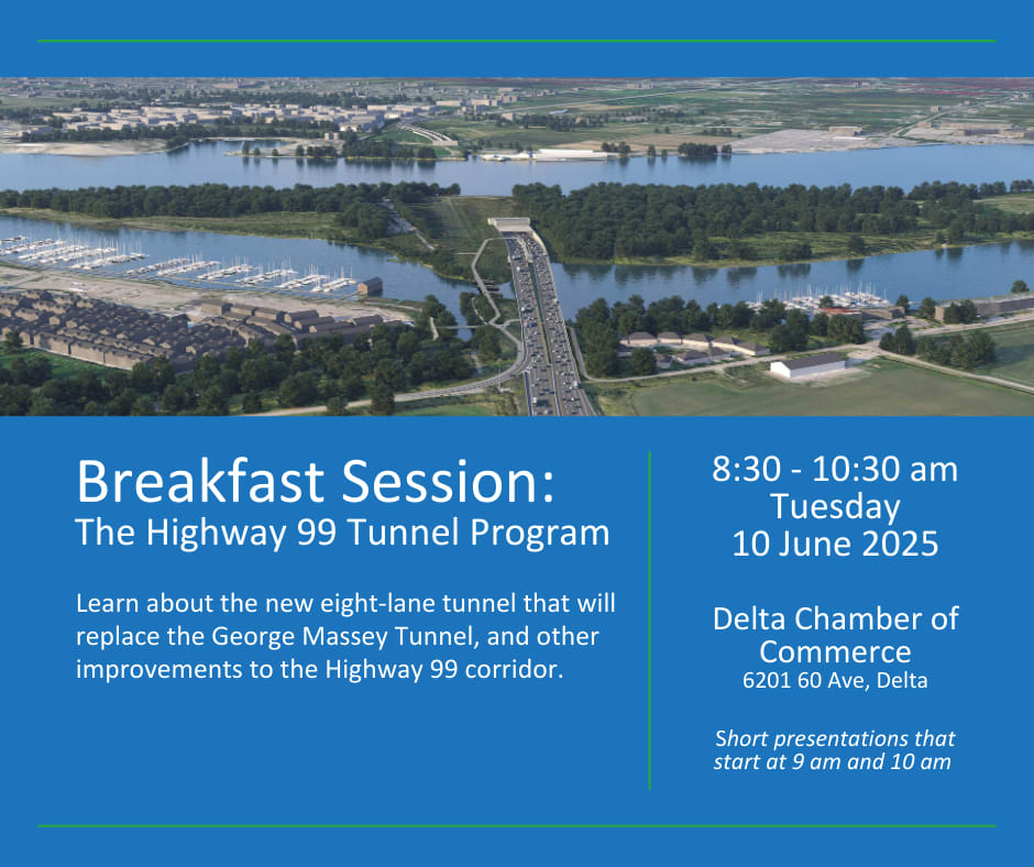 Join us for coffee and pastries while learning about the Highway 99 Tunnel Program Open House at the Delta Chamber of Commerce Head Office presented by the Transportation Investment Corporation.