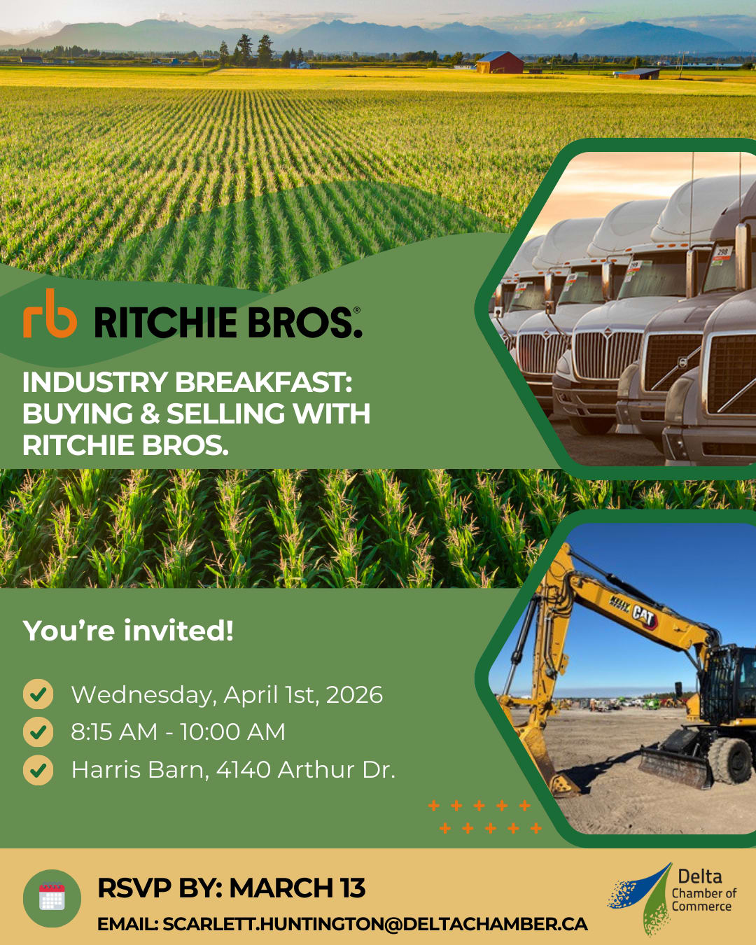 Join Ritchie Bros. at the Harris Barn, in partnership with the Delta Chamber of Commerce, on Wednesday, April 1st, 2026, for an informative breakfast session designed for agricultural and industrial businesses. Discover how Ritchie Bros. goes beyond auctions to act as a trusted equipment partner, helping businesses make confident, strategic buying and selling decisions across a wide range of equipment needs.
